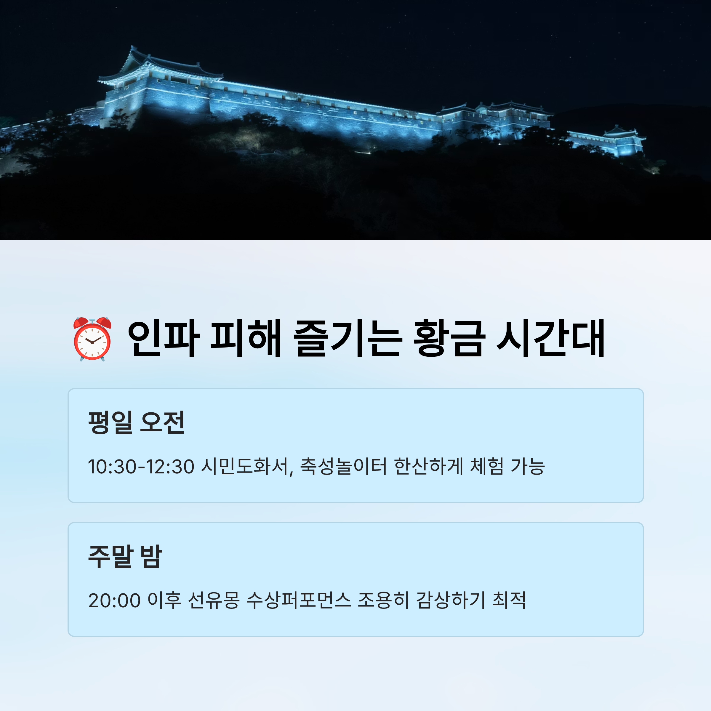 📌 **평일 오전** (10:30~12:30): 투어, 전시 체험은 한산하게 즐길 수 있는 황금 시간대예요. 특히 시민도화서나 축성놀이터는 여유 있게 즐길 수 있어요.