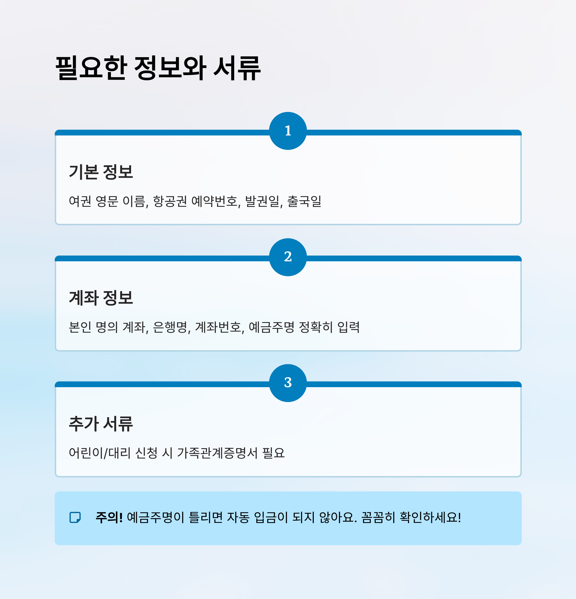 환급 신청을 위해서는 복잡한 서류 없이 간단한 정보만 입력하면 되지만, 경우에 따라 몇 가지 서류를 첨부해야 할 수도 있어요. 기본적으로는 여권 영문 이름, 항공권 예약번호, 발권일, 출국일, 계좌번호만 입력하면 돼요. 단, 어린이나 해외 거주자일 경우 별도 서류가 필요할 수 있어요.