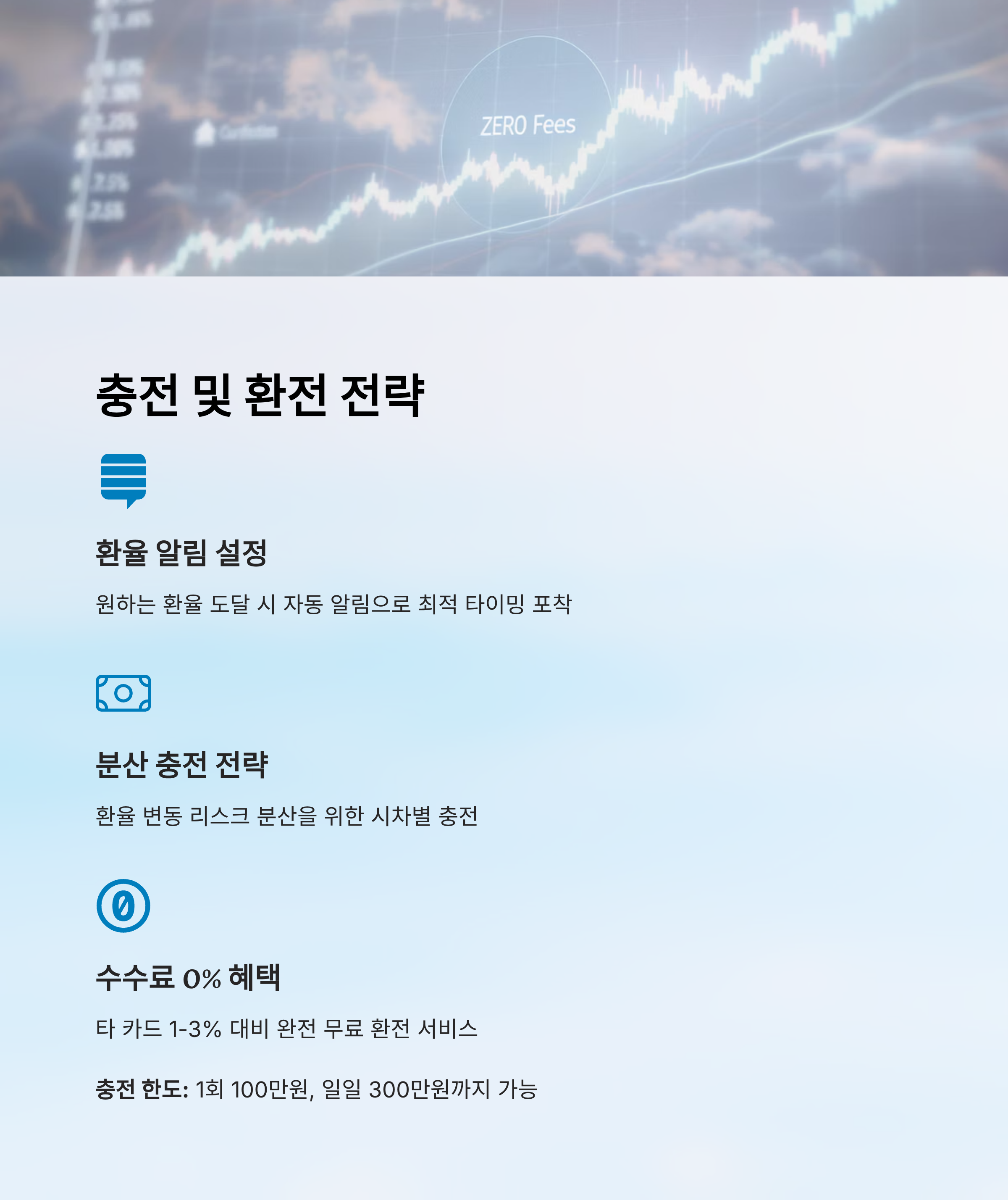 가장 좋은 팁은 **환율이 좋을 때 미리미리 충전**해 두는 거예요. 특히 유로화나 엔화는 하루에도 환율이 자주 바뀌니까, 알림 설정해두면 좋아요.