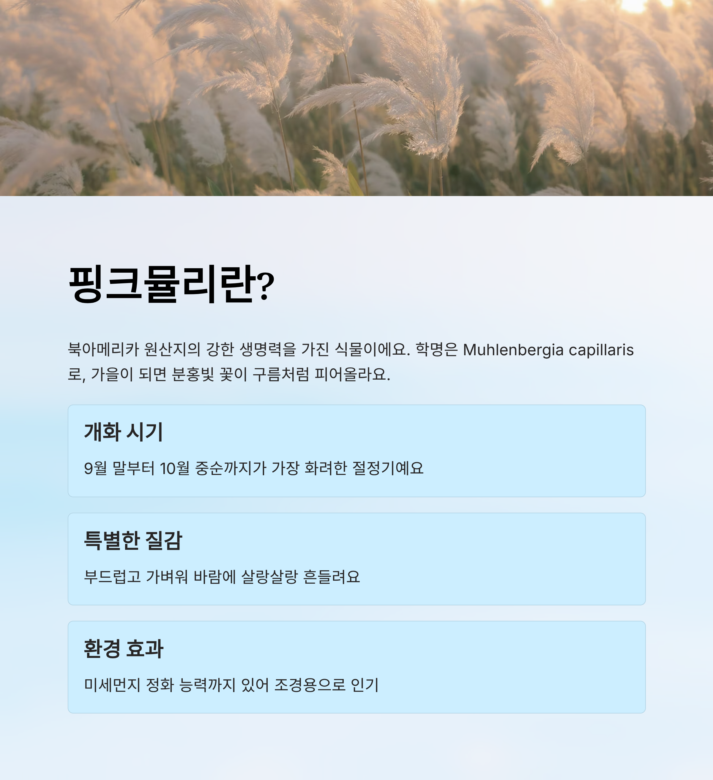 핑크뮬리는 학명으로 *Muhlenbergia capillaris*라고 불리는 식물이에요. 북아메리카가 원산지로, 원래는 황무지나 건조한 지역에서도 잘 자라는 강한 생명력을 가진 풀이죠. 잔디처럼 길쭉한 잎사귀를 가지며, 가을이 되면 얇은 꽃대에 분홍빛 꽃이 구름처럼 피어오른답니다.