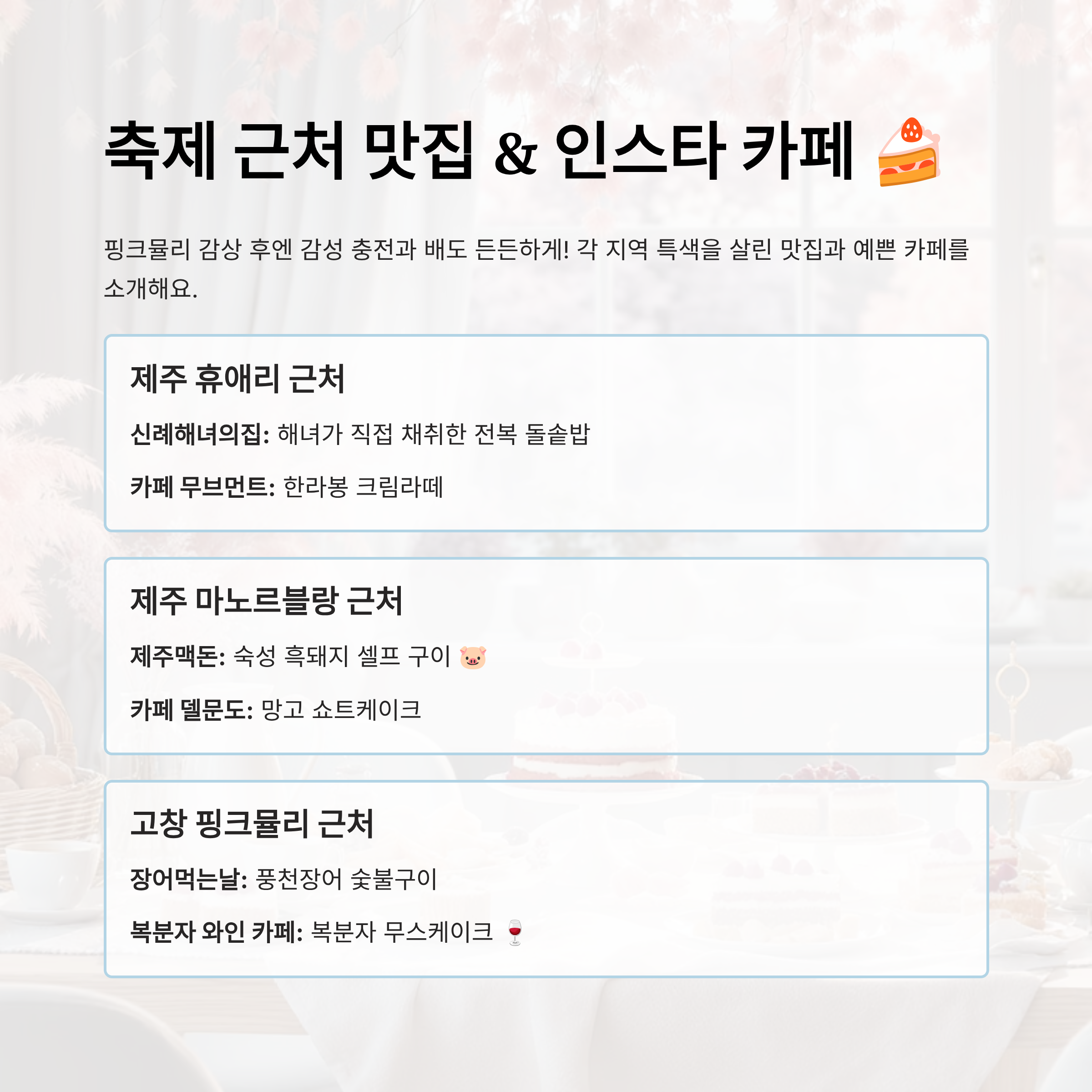 사진을 다 찍고 나면, 슬슬 배가 고프겠죠? 그럼 다음은 핑크뮬리 축제 근처의 인스타 감성 맛집과 카페를 소개할게요! 여행은 결국 먹는 재미까지 있어야 진짜죠 😋🍰