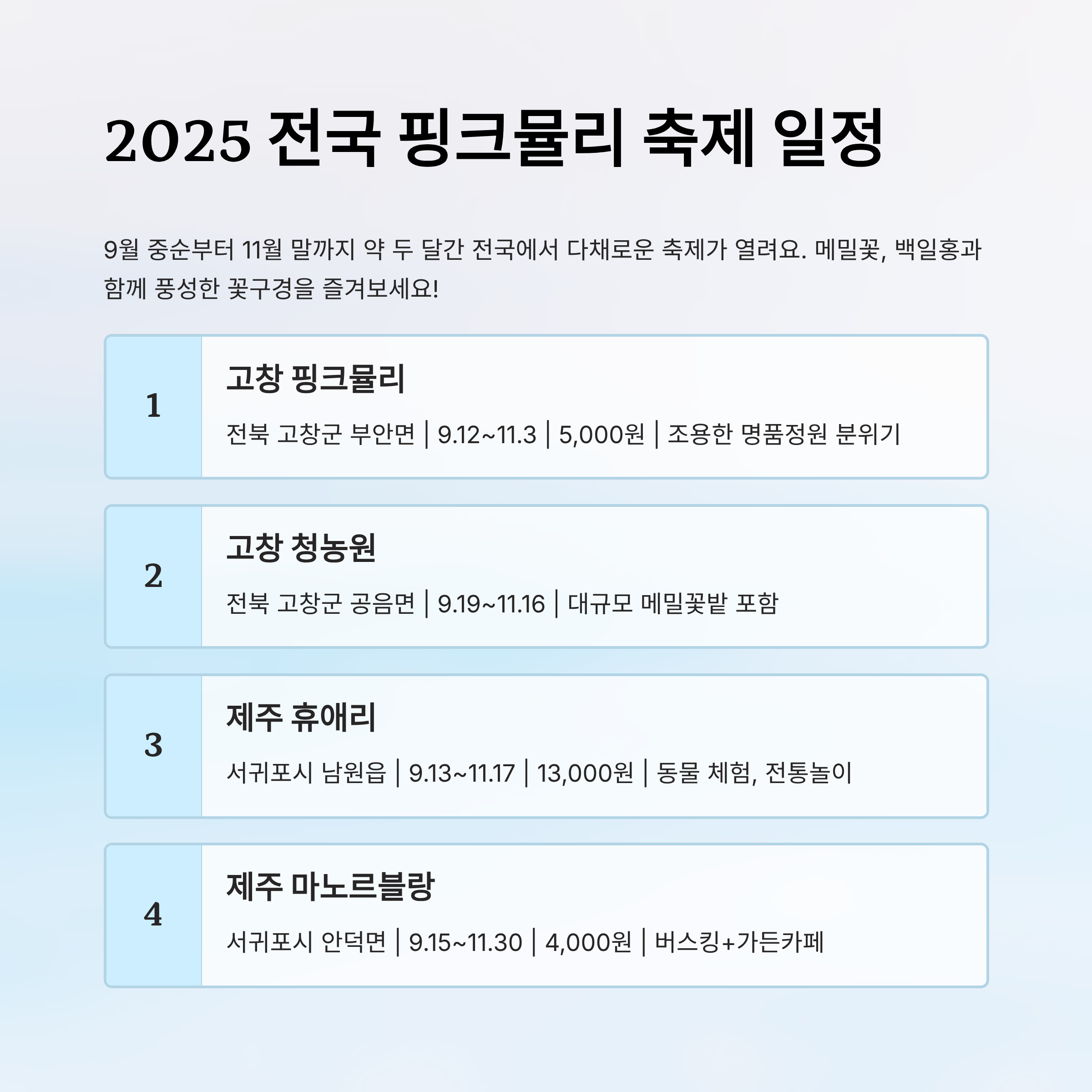 | 청농원 핑크뮬리 | 공음면 청천길 41-27 | 2025.09.19 ~ 11.16 | 미정 | 대규모+메밀꽃 포함 |