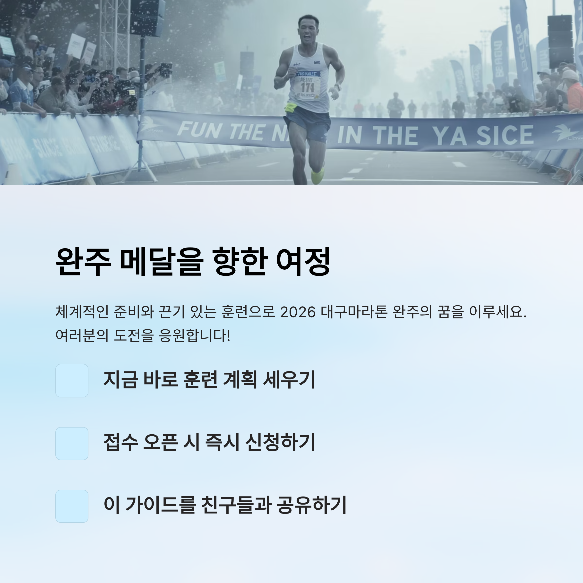 ⚠️ 면책조항: 본 글은 2026 대구마라톤 참가자들을 위한 일반적인 안내와 정보 제공 목적이며, 개인의 건강 상태와 준비 수준에 따라 결과가 달라질 수 있어요. 실제 참가 전에는 반드시 본인의 컨디션과 건강 상태를 고려해 준비하세요.
