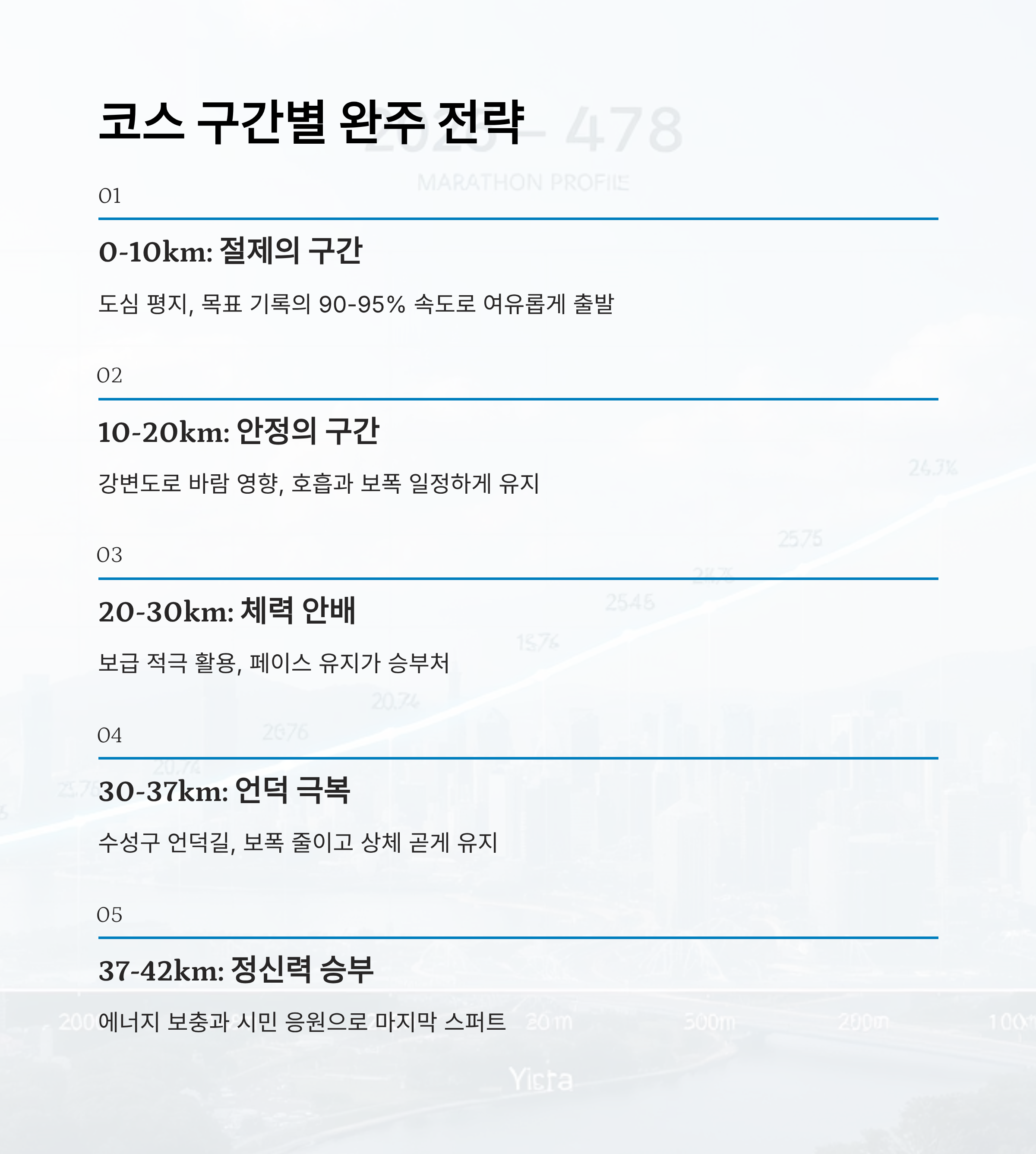 | 37~42km | 마지막 스퍼트 | 에너지 보충, 정신력으로 버티기 |
