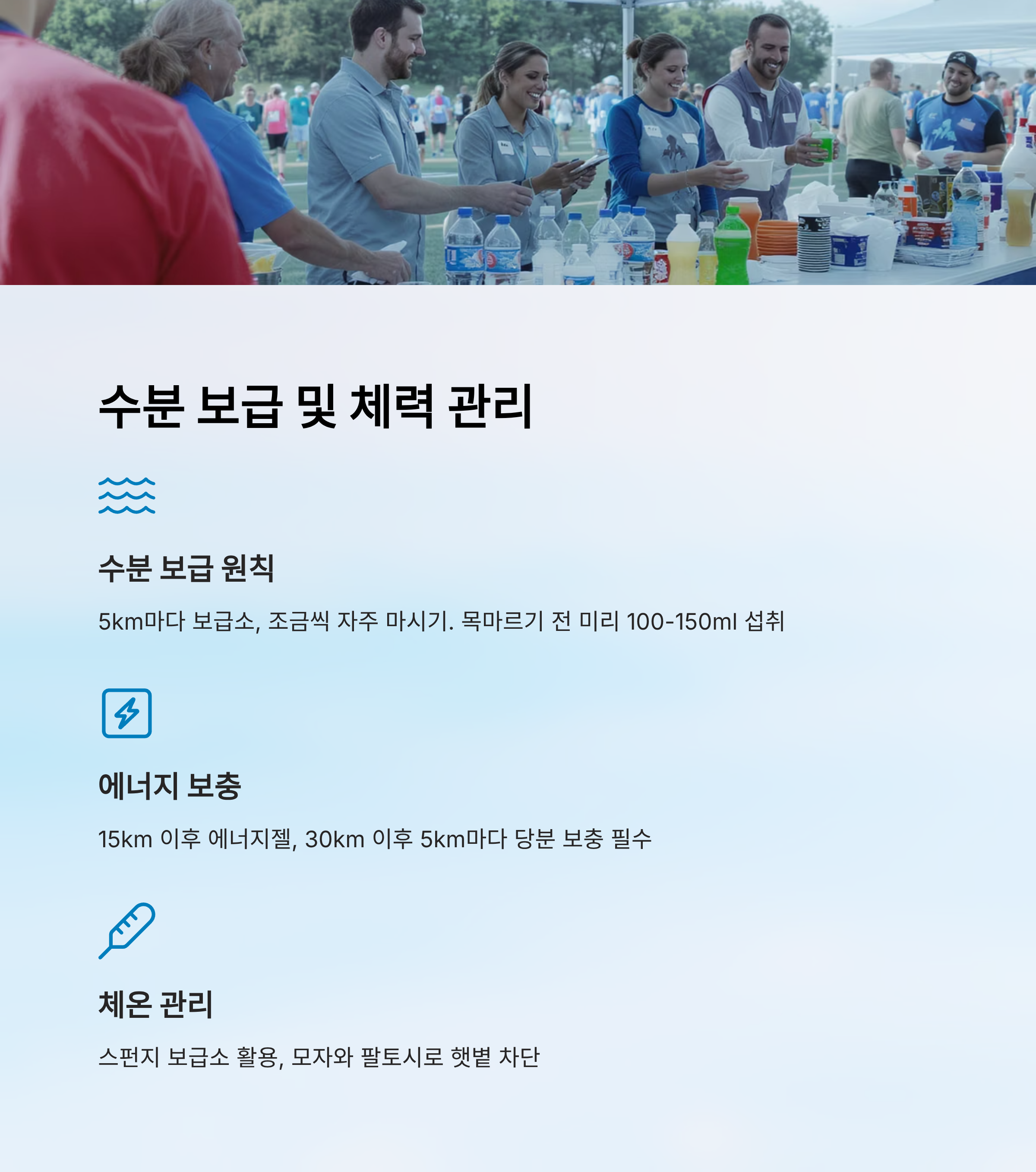 | 30km | 물, 스포츠음료, 간식 | 당분 보충, 보폭 조절 |