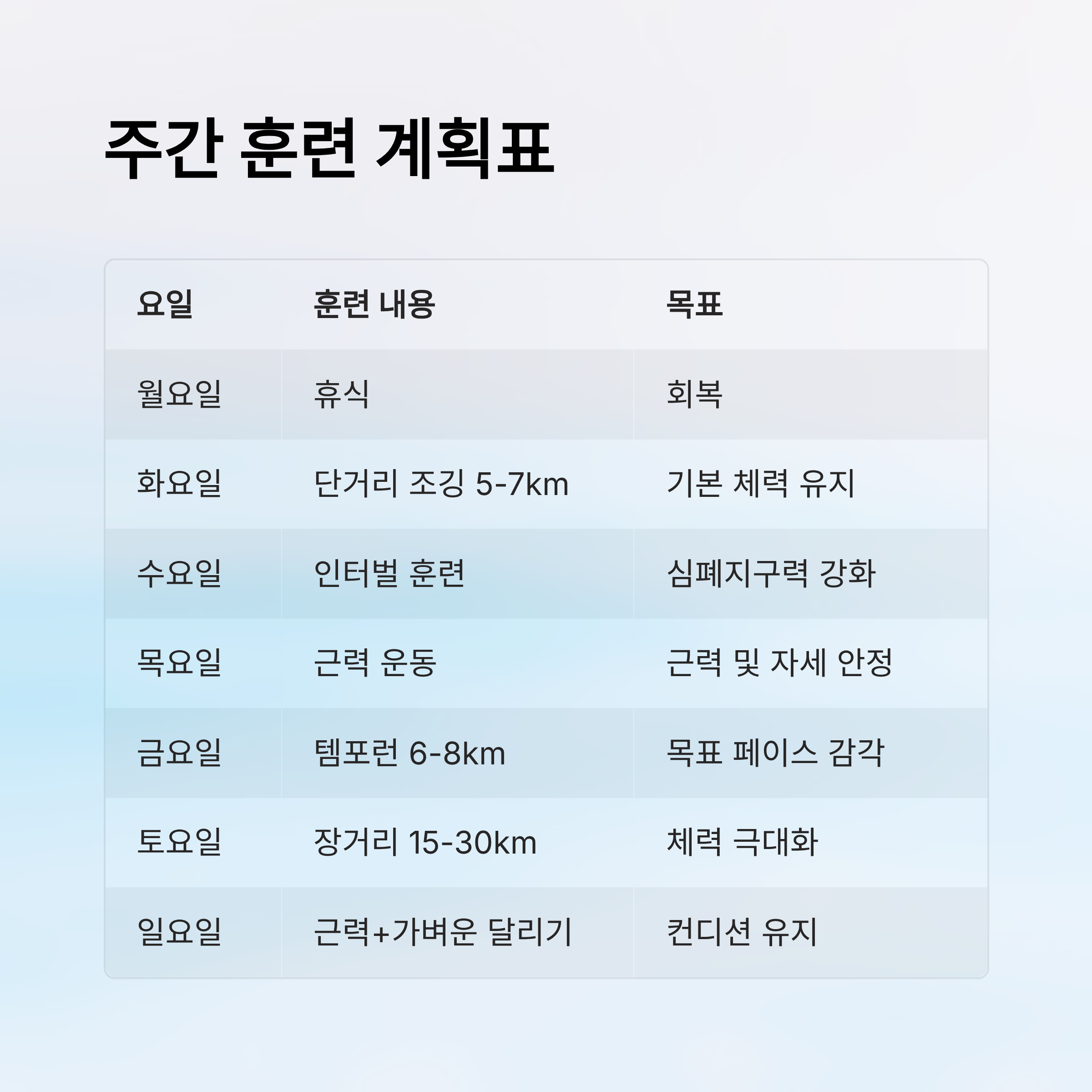 | 일요일 | 근력 운동 + 가벼운 달리기 | 보강 및 컨디션 유지 |