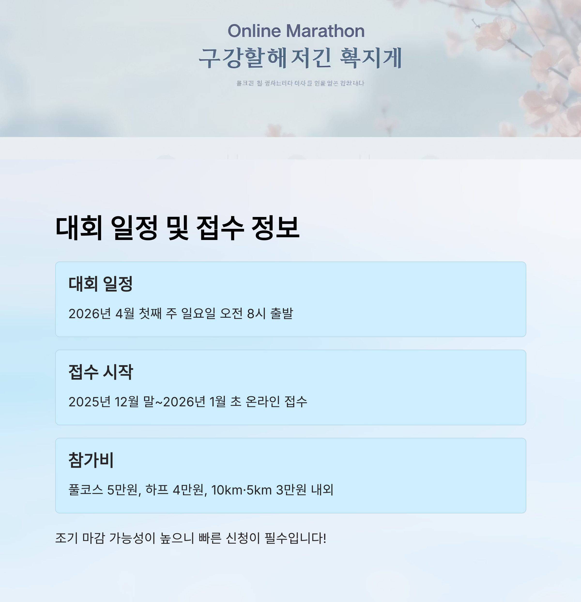 | 참가비 | 풀코스 5만 원 / 하프 4만 원 / 10km·5km 3만 원 내외 |